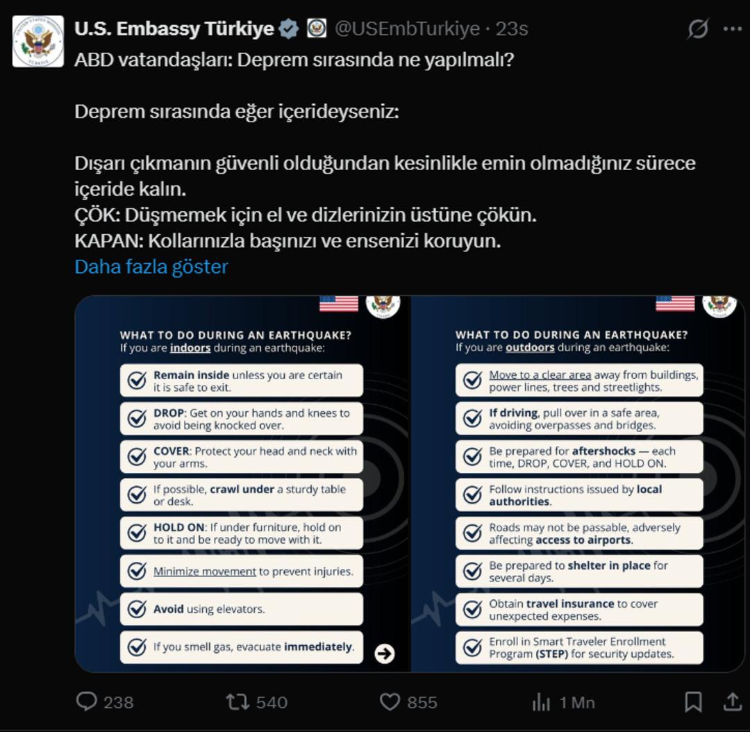 ABD’nin Ankara Büyükelçiliği, olası bir deprem senaryosuna karşı Türkiye’de yaşayan vatandaşlarını uyardı. Marmara’da yaşanabilecek bir deprem senaryosuna karşı ABD vatandaşlarını bilgilendirmek amacıyla kapsamlı bir güvenlik duyurusu yayımladı. ABD Büyükelçiliği, sosyal medya platformu X üzerinden yaptığı paylaşımda, “Deprem sırasında ne yapılmalı?” başlığını kullandı.