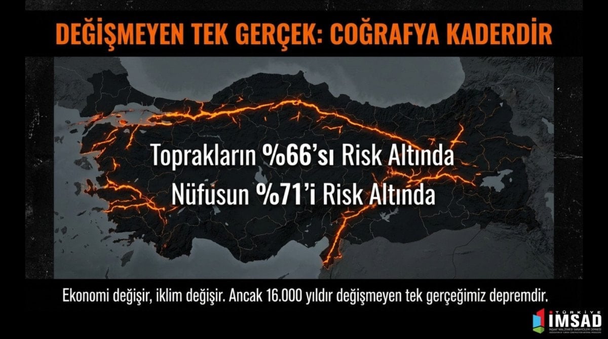 Türkiye İMSAD Yönetim Kurulu Başkanı Tayfun Küçükoğlu, Türkiye’nin bir deprem ülkesi olduğunu vurgulayarak, “Ülkemiz topraklarının yüzde 66’sı, nüfusumuzun ise yüzde 71’i orta ve yüksek riskli deprem bölgelerinde yaşıyor. Risk alanı tanımı genişletildiğinde bu oran yüzde 90’a kadar çıkıyor. Her büyük depremin ardından toplum olarak tüm dünyaya örnek bir dayanışma sergiliyoruz. Arama kurtarmada, yardımlaşmada ve yaraları sarmada çok büyük bir güç ortaya koyuyoruz. Bu tablo, korkuya teslim olmayan bir toplum olduğumuzu gösteriyor.” dedi.