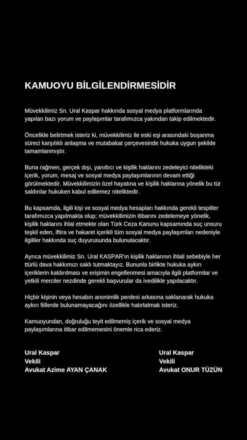 Ayrıca müvekkilimiz Sn. Ural Kaspar’ın kişilik haklarının ihlali sebebiyle her türlü dava hakkımızı saklı tutmaktayız. Bununla birlikte hukuka aykırı içeriklerin kaldırılması ve erişimin engellenmesi amacıyla ilgili platformlar ve yetkili merciler nezdinde gerekli başvurular da ivedilikle yapılacaktır.